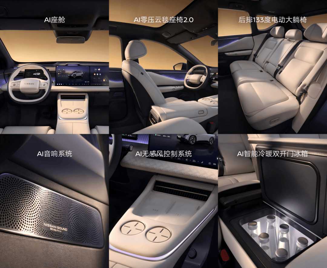 空間設計上,NX8通過高集成電驅和優化后驅布局,在4870×1920×1680mm的車身尺寸下,實現了1934mm有效室內長度、1285mm有效室內高度,得房率高達83%。后排膝部空間達760mm,后備箱容積773L,可容納13個20寸行李箱。配置層面,新車將AI技術深度融入全車軟硬件:語音助手“小尼”支持700余個智慧場景,Nissan Sound AI音響系統通過AI調音優化音質,無感空調系統利用AI識別乘員位置消除風感,雙開門智能冷暖冰箱配備AI調溫功能。座椅系統則由主駕AI零壓云毯座椅2.0(標配電動調節、通風、加熱、按摩功能)、前排AI零重力座椅和后排133度電動大躺椅組成,形成“AI大沙發”組合。