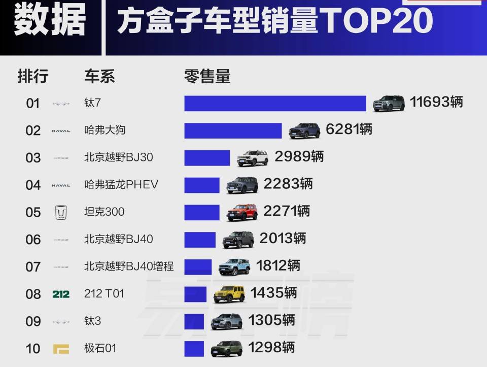 市場數據印證了這一趨勢的爆發力。據汽車平臺統計,2026年2月國內方盒子車型零售量前三甲中,鈦7以11693輛的成績登頂,哈弗大狗與北京越野BJ30緊隨其后。值得注意的是,榜首車型鈦7憑借硬派造型與新能源技術的深度融合,精準捕捉到消費者對"豪華配置+智能科技"的雙重期待,其單月銷量突破萬輛的表現,標志著這類車型已突破傳統小眾市場的邊界。