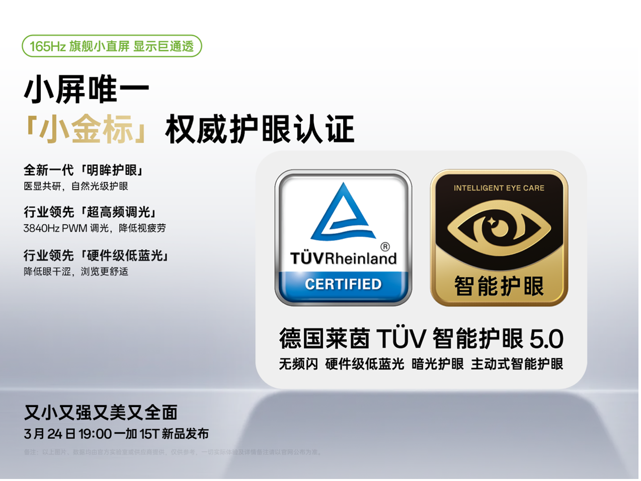 一加 15T 搭載全新「明眸護眼」技術,結合硬件級低藍光與至低 0.04 的 SVM 行業領先低頻閃,無論是暗光下追劇,還是長時間瀏覽文檔,都能有效緩解用戶視覺疲勞,配合七大 AI 主動護眼功能,成功斬獲小屏手機唯一的「小金標」護眼認證,樹立小屏旗艦護眼新標桿。