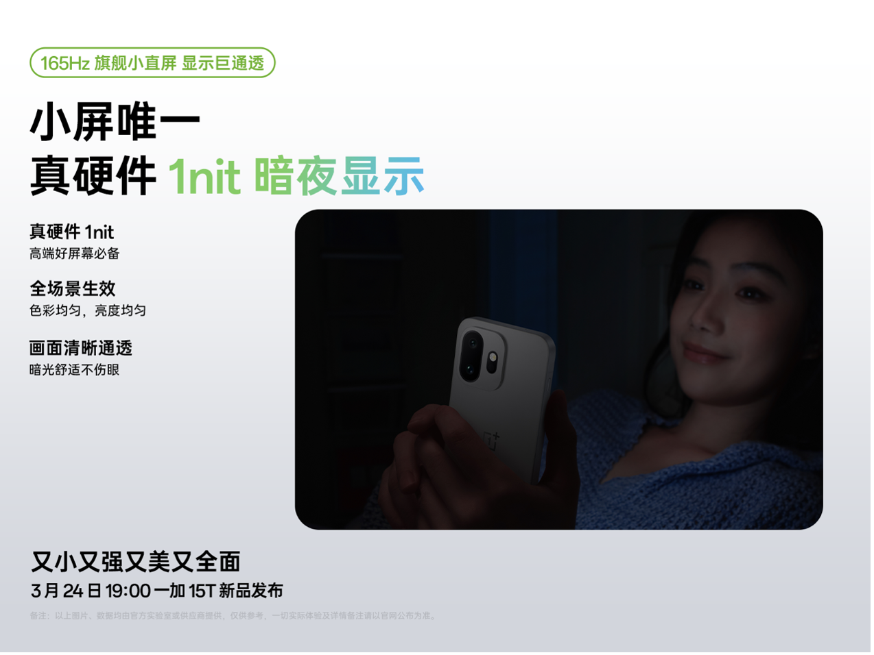 3 月 23 日,一加宣布全新小屏旗艦一加 15T 將搭載 165Hz 旗艦小直屏,首次為小屏用戶帶來超流暢的 165Hz 超高刷體驗。該屏幕經「自研屏幕科學產線」二次校準,擁有「真硬件 1nit 暗夜顯示」與全新「明眸護眼」等多項屏顯黑科技,并獲得小屏旗艦唯一「小金標」護眼認證,在流暢度、顯示素質、暗光顯示、護眼能力四大維度全面升級,引領小屏屏顯體驗大換代。