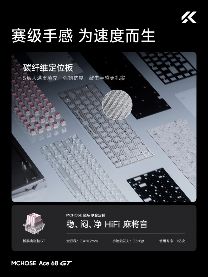 手感方面,邁從Ace 68 GT搭載了粉泰山磁軸GT,敲擊聲呈現出磁軸中難得的“穩、悶、凈”HiFi麻將音,配合碳纖維定位板和五層大滿貫填充,進一步優化內部結構,有效消除空腔音與共振雜音,確保每一次按壓都扎實純粹、反饋清晰。鍵盤側面保留了獨立RT按鍵,支持一鍵切換三套板載參數,方便不同游戲場景快速適配;機身底部采用鋁合金陽極氧化裝飾背板,提升整體質感與視覺層次;同時配備可拆卸人體工學手托,為長時間游戲提供更好的手腕支撐,緩解使用疲勞。