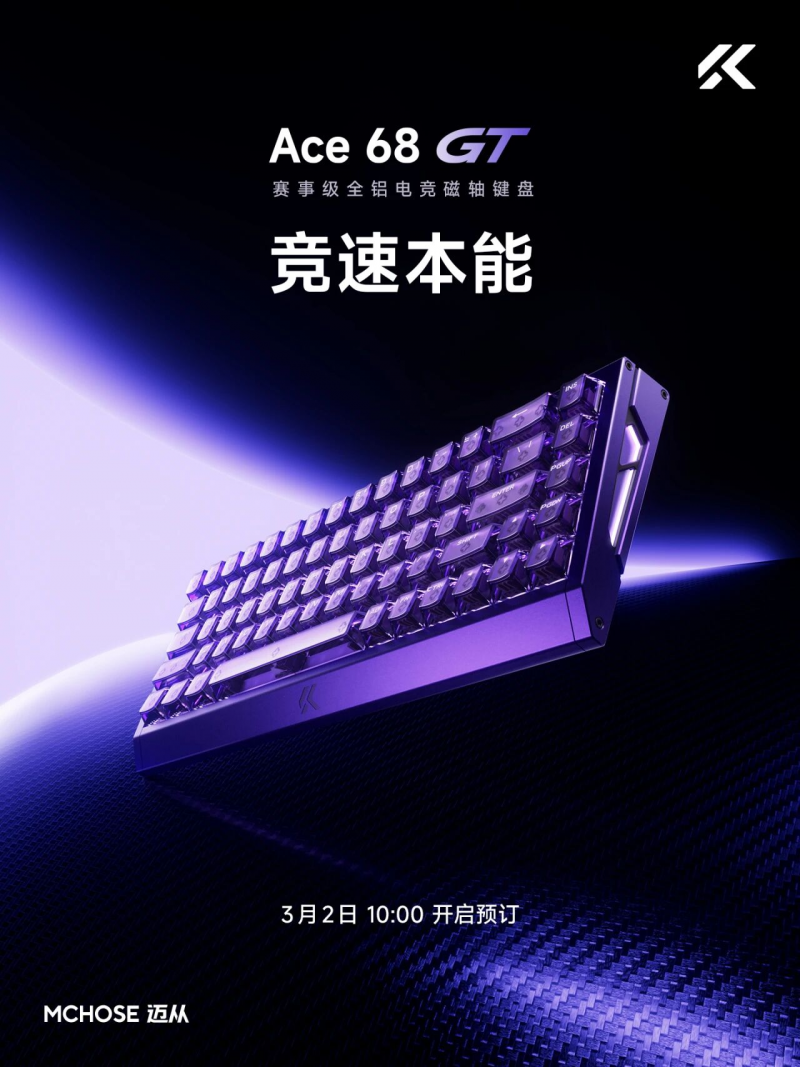 邁從Ace 68系列提供了三個側重點不同的選擇:邁從Ace 68主打均衡性能,兼顧辦公與游戲雙重需求;邁從Ace 68 Air以全系混軸玩法和炫彩律動燈箱為特點,配合輕量化機身,適合喜歡軸體搭配和桌面燈效的玩家;邁從Ace 68 Turbo則搭載全自研天問方案,實現16K回報率+0.06ms延遲,是追求極限性能玩家的首選。