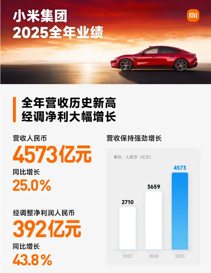 小米集團近日公布2025年度財務報告,全年營收突破4572.9億元人民幣,較上年增長25%,調整后凈利潤達391.7億元,同比增長44%,超出市場預估的391.2億元。這一成績單中,智能電動汽車及AI等創新業務表現尤為亮眼,全年收入達1061億元,同比激增223.8%,成為集團增長的核心引擎。