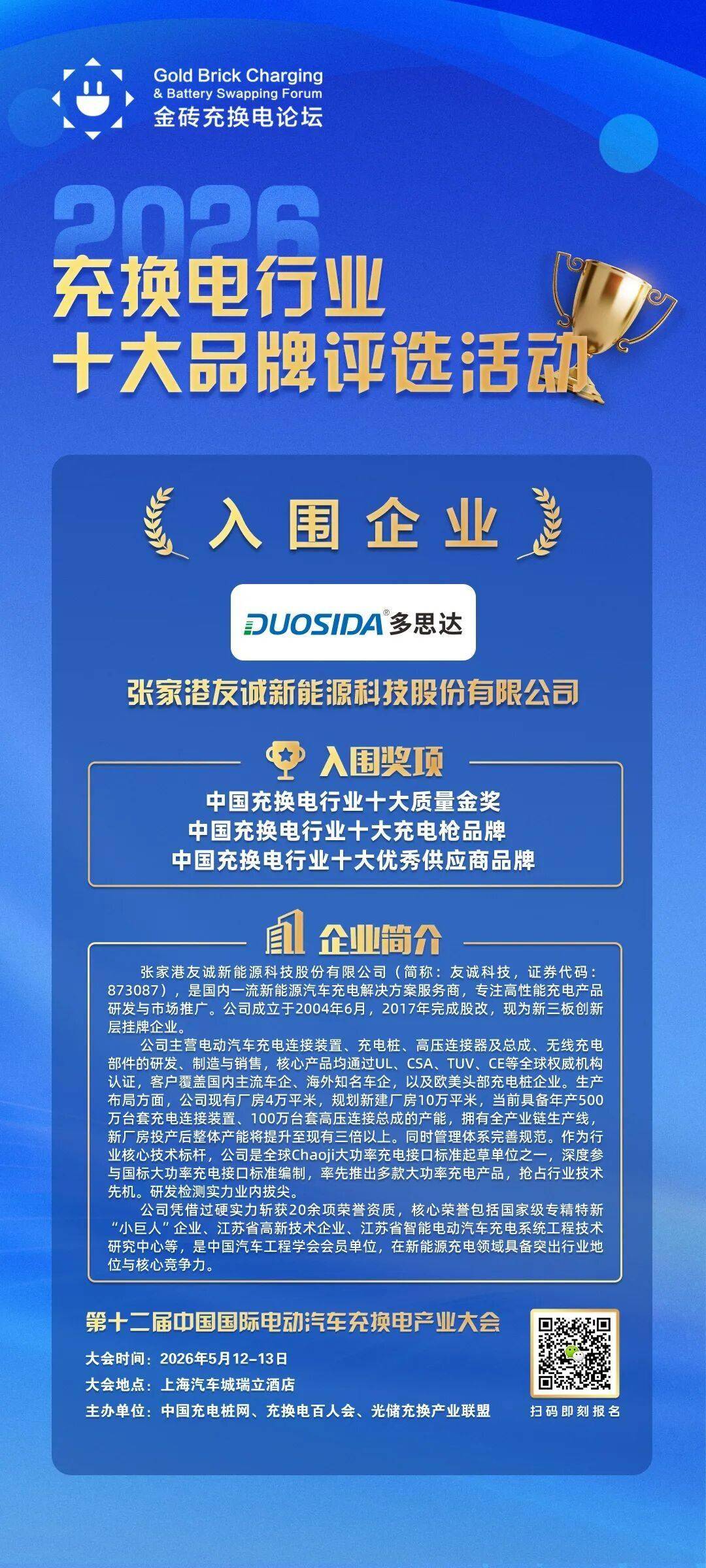 為加速推動充換電產業邁向高質量發展新階段,由金磚充換電論壇組委會主辦的“2026中國充換電行業十大品牌”系列獎項評選活動正式啟動。此次評選覆蓋充換電全產業鏈,涵蓋生產制造、運營服務、平臺建設、核心部件研發等領域,旨在通過樹立行業標桿,激發企業創新活力,促進產學研深度融合。