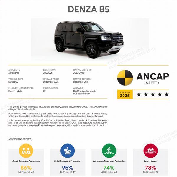 在ANCAP的評估體系中,方程豹豹5最終獲得五星安全評級,這一成績得益于其在成人保護(hù)、兒童保護(hù)、行人保護(hù)和安全輔助四大核心領(lǐng)域的卓越表現(xiàn)。其中,兒童保護(hù)得分率高達(dá)95%,創(chuàng)下該機構(gòu)歷年測試紀(jì)錄,成為兒童安全領(lǐng)域的標(biāo)桿車型。成人保護(hù)方面,車輛在多項嚴(yán)苛測試中展現(xiàn)出對乘員的全方位防護(hù)能力。
