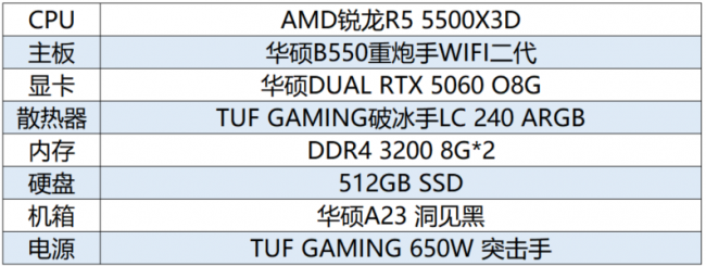 首先為大家推薦一套極具性價(jià)比的銳龍5000電競(jìng)平臺(tái)。以華碩B550重炮手WIFI二代主板為核心,搭配AMD銳龍5 5500X3D處理器,華碩DUAL RTX 5060 O8G顯卡等高性能硬件,高幀暢玩無壓力!