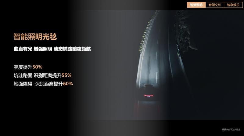 夜間行車時,針對坑洼路面、彎道或者看不清前路的復雜路況,HUAWEI XPIXEL智能車燈模組推出了“智能照明光毯”技術。其特別之處在于,不是簡單地照亮前方,而是像一位“會預判的領航員”。通過結合車輛行駛狀態和導航信息,提前預判車輛即將經過的路徑,并在路面上投射出一條與車輛同寬、鋪滿前方的“光毯”。無論彎道穿行還是途徑顛簸路段,燈光均可隨車輛動態實時調整,始終實現精準、穩定的路面照明。