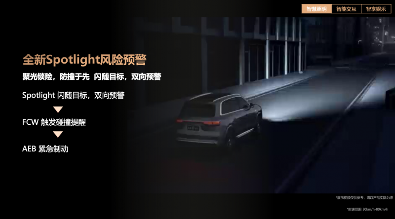 比如,當系統檢測到有行人或非機動車突然闖入,存在碰撞風險時,“全新Spotlight風險預警”功能會與華為乾崑智駕ADS聯動,用一束高亮光精準鎖定目標并快速閃爍,實現車對人的“雙向預警”,將被動警示升級為主動安全干預,有效保障駕駛員與行人的安全。