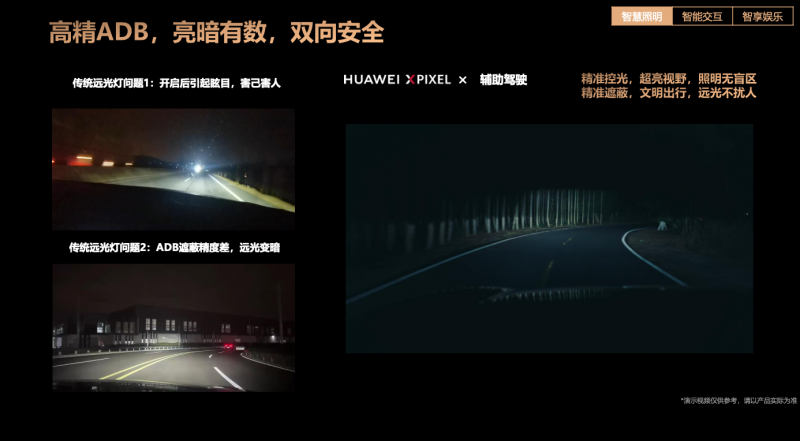 安全是用戶出行的基石。夜間行車時,駕駛員視野受限,如果再遇到對向來車開啟遠光燈,則更難以看清前方路況。針對這一駕駛者的共同困擾,HUAWEI XPIXEL智能車燈模組將華為乾崑智駕ADS的強大感知能力與高精ADB(自適應遠光燈)技術相結合,讓車燈擁有了“智慧”。簡言之,當系統識別到對向車輛或行人時,可在毫秒間自動調整光線,既能為駕駛者保留完整的照明視野,又能精準遮蔽照射到其他車輛或行人的光線,同時還能屏蔽對向車輛的遠光燈干擾,極大降低了夜間會車的事故率,讓遠光燈不再只是“照亮自己”的工具,而成為兼顧雙向安全的可靠保障。
