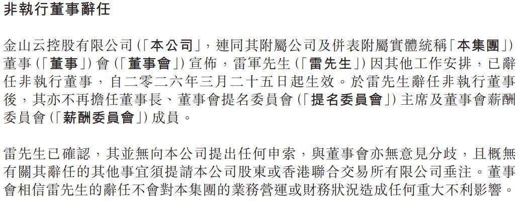港股上市公司金山云近日發布重要人事變動公告,自2026年3月25日起,雷軍將不再擔任公司非執行董事及董事長職務。這位自2012年金山云創立之初便深度參與的科技領袖,在執掌公司11年后選擇卸任。公告特別強調,此次調整系雷軍基于個人工作安排的主動選擇,與董事會不存在任何分歧,且不會對公司運營產生實質性影響。