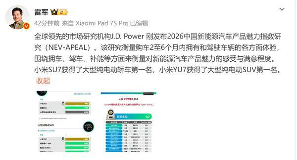 全球知名市場研究機構J.D. Power最新發布的2026中國新能源汽車產品魅力指數研究報告顯示,小米汽車旗下兩款主力車型在細分市場評選中斬獲雙料冠軍。其中,小米SU7以綜合評分第一的成績領跑大型純電動轎車領域,小米YU7則在大尺寸純電SUV品類中拔得頭籌。