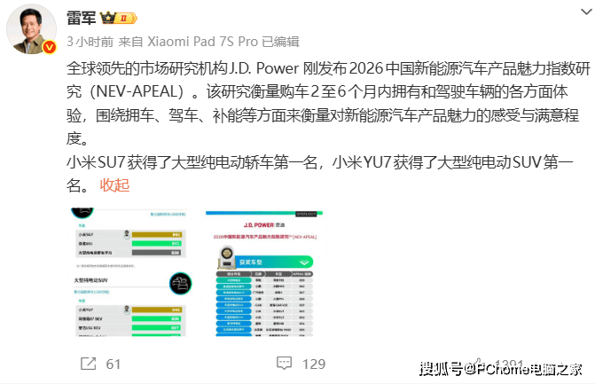 小米集團(tuán)在新能源汽車領(lǐng)域再傳捷報(bào)。近日公布的2026中國(guó)新能源汽車產(chǎn)品魅力指數(shù)研究榜單(NEV-APEAL)顯示,小米旗下SU7與YU7兩款主力車型分別在各自細(xì)分市場(chǎng)中摘得桂冠。這一成績(jī)標(biāo)志著小米汽車在用戶滿意度方面取得突破性進(jìn)展。