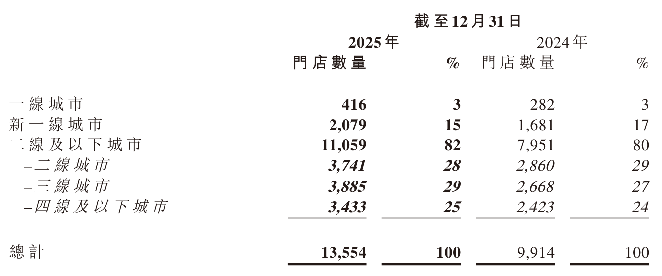 門店擴張是古茗控股2025年發展的核心戰略之一。報告顯示,截至2025年12月31日,公司門店總數突破13,554家,較2024年底的9,914家增長36.7%,覆蓋全國超過200個各線級城市。從城市分布來看,二線及以下城市仍是主力市場,門店數量達11,059家,占總數的82%;新一線城市門店為2,079家,占比15%;一線城市門店僅416家,占比3%。這一布局策略體現了公司深耕下沉市場的戰略定位。