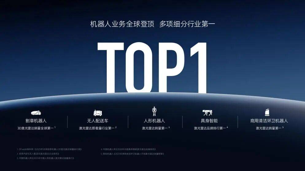 機(jī)器人業(yè)務(wù)成為公司增長(zhǎng)的核心引擎。第四季度機(jī)器人激光雷達(dá)銷量達(dá)22.12萬(wàn)臺(tái),同比激增2565.1%;全年銷量突破30.3萬(wàn)臺(tái),同比增長(zhǎng)1141.8%,穩(wěn)居全球機(jī)器人激光雷達(dá)市場(chǎng)銷量榜首。在細(xì)分領(lǐng)域,公司斬獲全球割草機(jī)器人、商用清潔環(huán)衛(wèi)機(jī)器人、中國(guó)人形機(jī)器人、無(wú)人配送車及具身智能機(jī)器人等多個(gè)領(lǐng)域的銷量冠軍,形成全面領(lǐng)先優(yōu)勢(shì)。