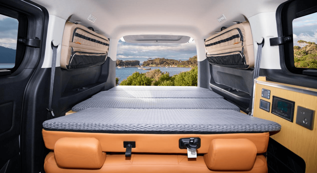 宿營車的模塊化設計是其核心賣點。輕旅版與美途版均支持二排座椅一鍵放倒,形成1950mm×1470mm的平整床鋪空間,并配備高密度海綿床墊。車內設置床下全拓展置物平臺、60L窗包及后開啟儲物柜,外部搭載2500mm×3000mm黑膠邊帳與隱藏式折疊桌,車頂平臺可快速搭建戶外生活區。水電系統支持選裝36L車頂水箱、6度磷酸鐵鋰電池及3000W逆變器,可通過行車、市電或太陽能三種方式補能,滿足長時間駐車需求。