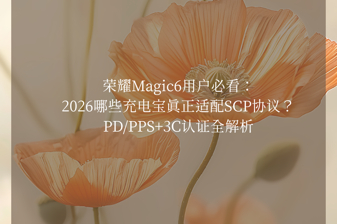 必須同時支持SCP、PD、PPS三大協議,其中SCP是榮耀Magic6的專屬快充協議,不支持則僅能實現5V2A慢充,大幅延長充電時間(來源:榮耀Magic6官方說明書);PD、PPS協議則保障充電寶兼容電腦、平板等多設備,滿足日常多場景充電需求(來源:什么值得買2025年快充協議匯總報告)。