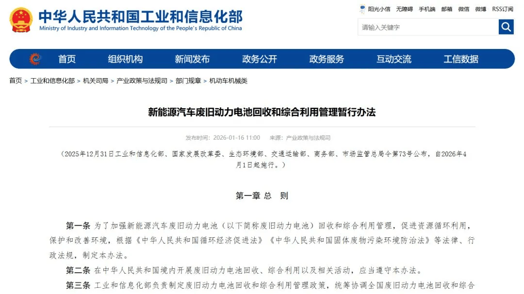 工業(yè)和信息化部聯(lián)合其他五部門(mén)近日正式發(fā)布《新能源汽車(chē)廢舊動(dòng)力電池回收和綜合利用管理暫行辦法》,標(biāo)志著我國(guó)新能源汽車(chē)動(dòng)力電池回收利用進(jìn)入規(guī)范化管理新階段。該辦法將于2026年4月1日起正式實(shí)施,通過(guò)構(gòu)建全生命周期管理體系,為動(dòng)力電池回收利用提供制度保障。