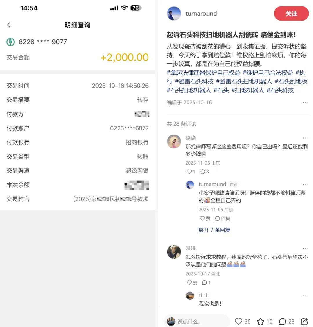 為了固定證據,戴先生化身“偵探”,最長一次連續跟拍機器工作47分鐘。每當聽到剮蹭聲,便立即暫停設備,跪地比對劃痕位置。這些視頻資料最終成為關鍵證據。2024年7月,他正式起訴石頭科技。經過一年拉鋸,2025年10月,法院二審開庭后石頭科技主動撤訴,一審判決生效。法院認定,企業未能證明產品無缺陷,而戴先生提供的證據鏈完整,證明機器人旋轉拖地功能是造成劃痕的直接原因。最終,石頭科技被判賠償2000元。