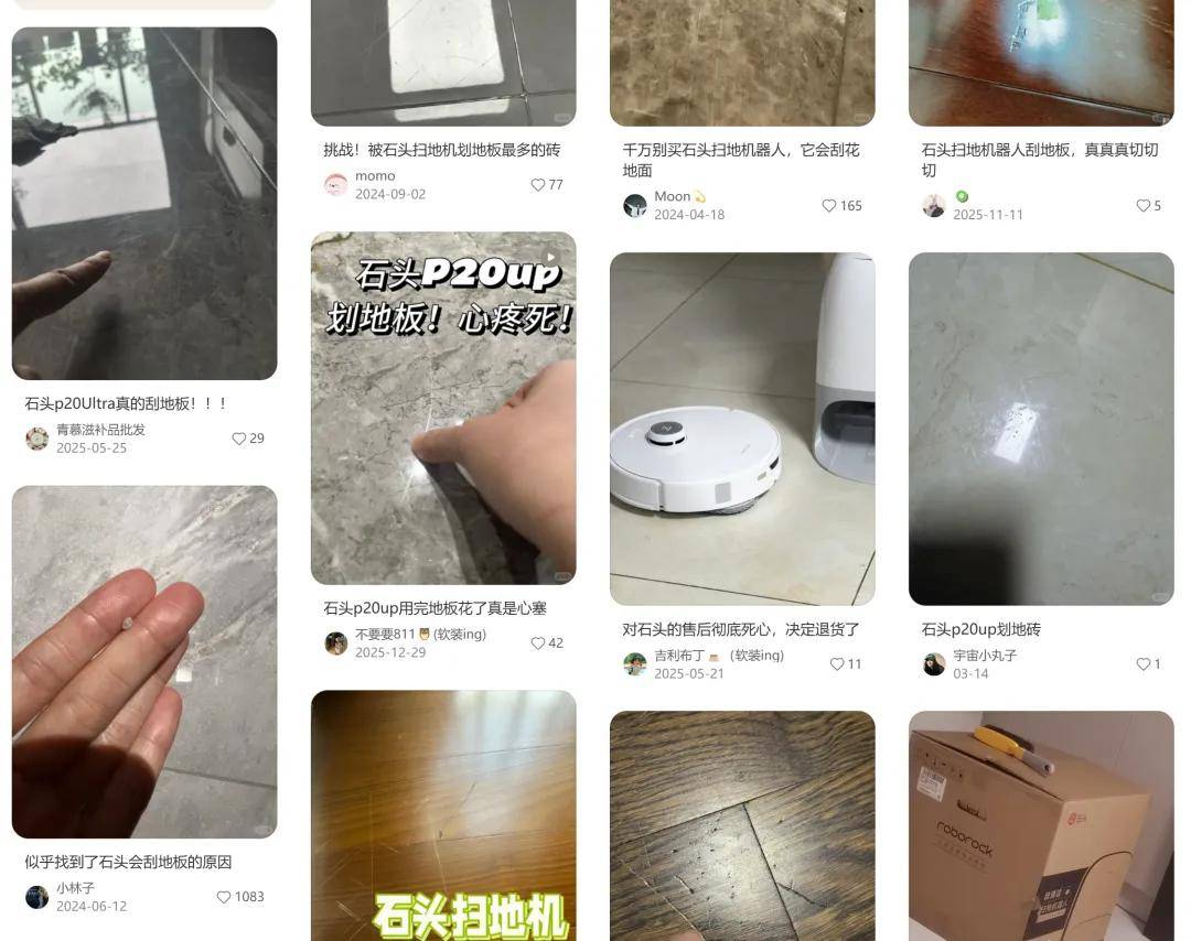 戴先生的遭遇并非個案。在小紅書等平臺搜索“石頭掃地機 劃傷”,大量用戶分享了類似經歷。從P10系列到P20系列,多款主力機型均被投訴導致瓷磚、木地板出現不可修復的劃痕。有用戶表示:“新房剛入住,掃地后出現一米多長的劃痕,簡直崩潰。”另有用戶通過慢鏡頭回放發現,劃痕多產生于機器旋轉拖地時,且一旦出現便無法通過清潔或打磨消除。