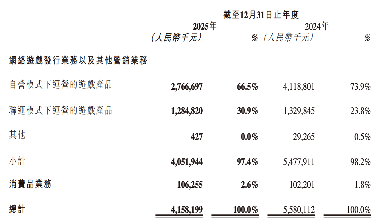 從收入構(gòu)成看,游戲業(yè)務(wù)仍是核心支柱,貢獻(xiàn)40.52億元,占比高達(dá)97.4%。其中自營游戲收入為27.67億元,同比減少32.83%,主要因公司優(yōu)化發(fā)行策略,收縮部分產(chǎn)品推廣規(guī)模,導(dǎo)致流水下滑。2024年上線的《斗羅大陸:史萊克學(xué)院》《野獸領(lǐng)主:新世界》等游戲收入回落,疊加網(wǎng)絡(luò)文學(xué)等非核心業(yè)務(wù)投入減少,進(jìn)一步拉低整體營收。新興消費(fèi)品業(yè)務(wù)表現(xiàn)亮眼,收入從2024年的1.8%提升至2.6%,達(dá)到1.06億元,成為增長新亮點(diǎn)。