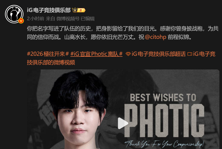 iG電子競(jìng)技俱樂部英雄聯(lián)盟分部近日迎來重大人員調(diào)整。根據(jù)最新發(fā)布的公告,原下路選手Photic已確認(rèn)離隊(duì),俱樂部在官方聲明中對(duì)其過往貢獻(xiàn)給予高度評(píng)價(jià):“你的名字已鐫刻在隊(duì)伍歷史中,賽場(chǎng)上的身影始終被我們銘記。感謝曾與戰(zhàn)隊(duì)并肩作戰(zhàn)的時(shí)光,愿未來繼續(xù)閃耀。”