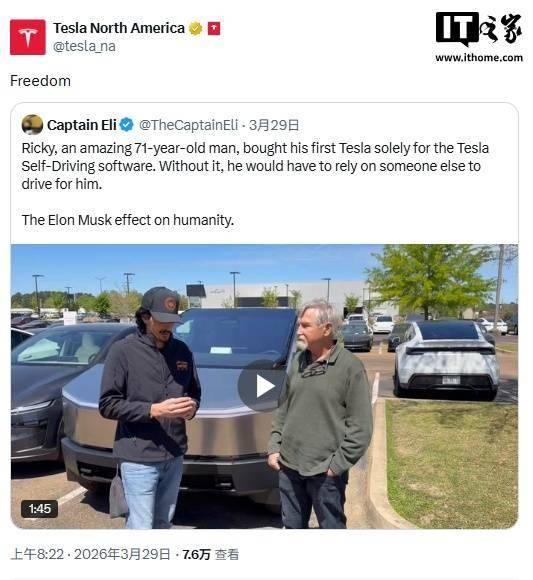 近日,特斯拉北美官方X賬號轉發了一則關于Cybertruck車主的采訪視頻,引發了公眾對自動駕駛系統安全性的廣泛討論。視頻中,一位名叫里基的特斯拉車主透露,由于視力持續衰退,他在眼科醫生的建議下購買了配備FSD(完全自動駕駛)功能的特斯拉車型。