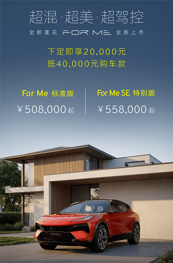 蓮花品牌旗下全新超跑SUV——FOR ME正式登場,共推出兩款配置車型,官方指導價區間為50.8萬至55.8萬元。作為全球首款基于超混架構打造的車型,新車融合了高性能插混系統與尖端科技配置,在動力性能與智能化領域展現出獨特競爭力。