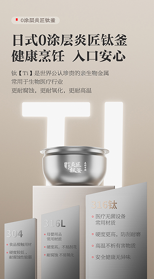 日式0涂層炎匠鈦釜:主打健康材質(zhì)與長期使用安心感。素材強調(diào)鈦(Ti)為親生物金屬,常用于生物醫(yī)療行業(yè),并強調(diào)耐腐蝕、耐氧化、耐高溫、硬度更高、防刮耐磨等方向。