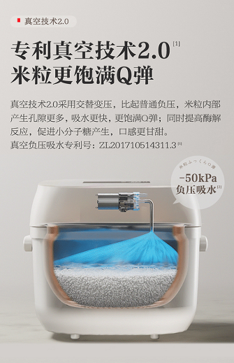 炊煮前通過真空系統(tǒng)抽出內(nèi)膽空氣,形成負(fù)壓環(huán)境,讓水更容易進(jìn)入米粒內(nèi)部。