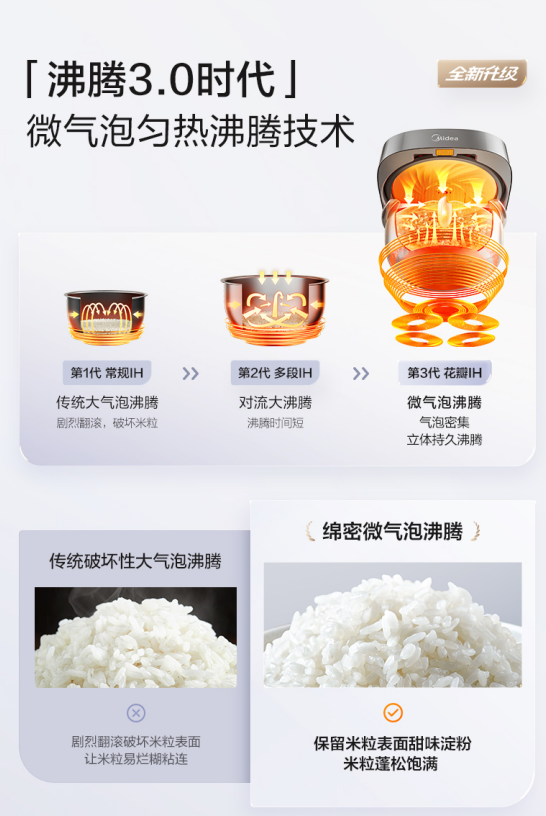 對應(yīng)家用效果:沸騰更溫和穩(wěn)定,保留米粒表面甜味淀粉,更蓬松飽滿。
