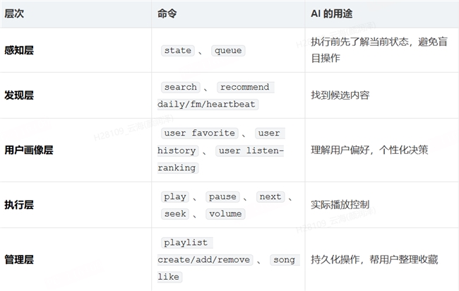 這個判斷背后有一個很直接的邏輯:CLI 命令是 AI Agent 最天然的工具調(diào)用形式。一個ncm-cli play --song xxx的命令,對 Claude、OpenClaw 里的 AI、或者任何其他 Agent 框架來說,調(diào)用方式完全一樣。CLI 本身不依賴任何 AI 框架,它就是一個能被任何東西調(diào)用的原子工具。