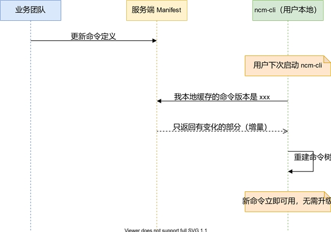 ncm-cli 引入了一套動態(tài)命令系統(tǒng),核心思想是:把命令的定義從代碼里移到服務(wù)端。