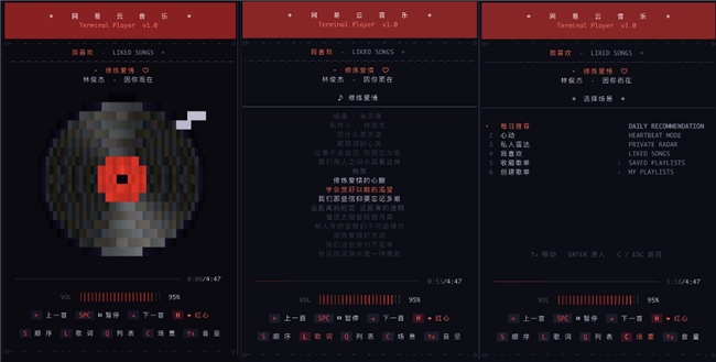 TUI 播放器是我們比較喜歡的功能之一——黑膠旋轉(zhuǎn)動畫、卡拉 OK 風(fēng)格歌詞同步、場景切換,在終端里有一種莫名的儀式感。