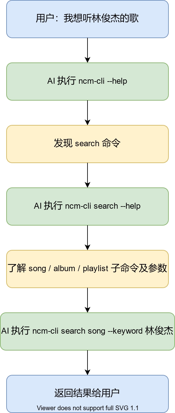 AI 拿到任務(wù)后,會先執(zhí)行ncm-cli --help看頂層有什么,再根據(jù)需要鉆進具體子命令查參數(shù),最后再執(zhí)行。整個過程和人第一次用一個新 CLI 工具的探索方式完全一樣。