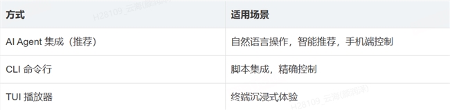 TUI 有一個值得一說的特性:它可以和 CLI 命令同時工作。TUI 跑著的時候,你仍然可以在另一個終端執(zhí)行ncm-cli next、ncm-cli volume 80,TUI 界面會實時響應(yīng)。這對 AI Agent 來說尤為自然——Agent 發(fā)出的命令和人在 TUI 里的操作是完全對等的。