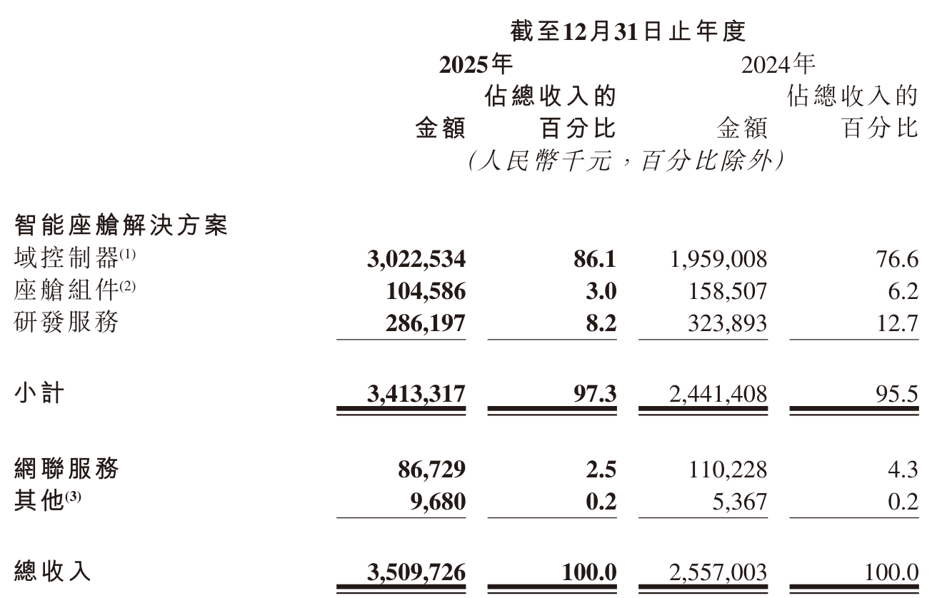 據財報披露,2025年博泰車聯智能座艙域控制器的交付量達到130萬臺,較2024年增長超過40%。這一增長直接推動了公司智能座艙解決方案收入的攀升,該板塊全年收入達34.13億元,占公司總營收的97.3%。其中,域控制器收入為30.22億元,占比86.1%;座艙組件收入為1.05億元,占比3%;研發服務收入為2.86億元,占比8.2%。
