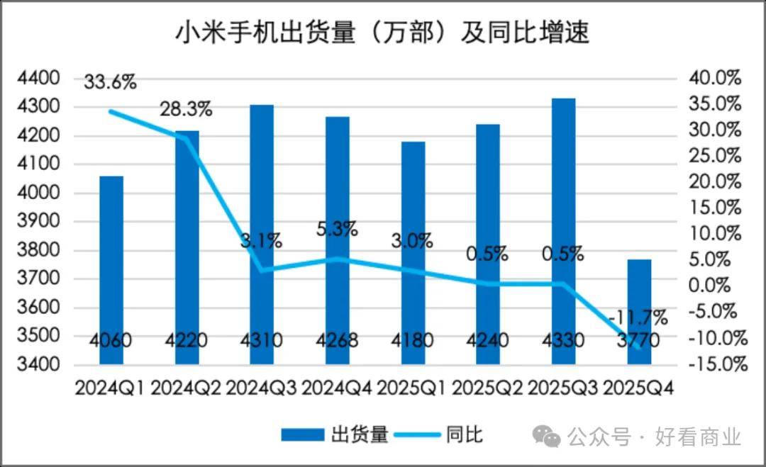 與汽車業務的高歌猛進形成鮮明對比的是,小米手機業務正陷入持續萎縮的困境。2025年,手機×AIoT板塊收入3512億元,同比增長僅5.4%,其中手機業務連續三個季度同比下滑。全球出貨量1.652億臺,同比減少2%,海外硬件收入下滑5%。印度市場從年出貨量超4000萬臺萎縮至1970萬臺,同比減少26%;歐洲市場雖以2180萬部出貨量成為海外最大市場,但也出現1%的降幅。毛利率方面,手機業務第四季度創下8.3%的新低,全年毛利率10.9%,顯著低于2024年的12.6%。存儲芯片價格暴漲、中低端機型占比過高、促銷讓利等因素,共同擠壓了利潤空間。