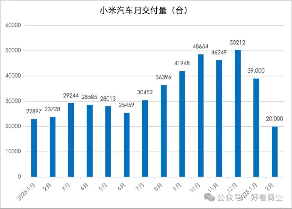 2026年第一季度尚未結束,小米汽車已感受到前所未有的交付壓力。年初設定的55萬輛年度目標,前兩個月僅完成6萬余輛,剩余9個月需平均每月交付5.18萬輛才能達標。這一數字背后,是初代SU7停產后主力車型YU7交付量下滑的現實——前兩個月分別交付3.9萬和2萬輛,而3月初周訂單已回落至4000輛左右,月訂單不足2萬。