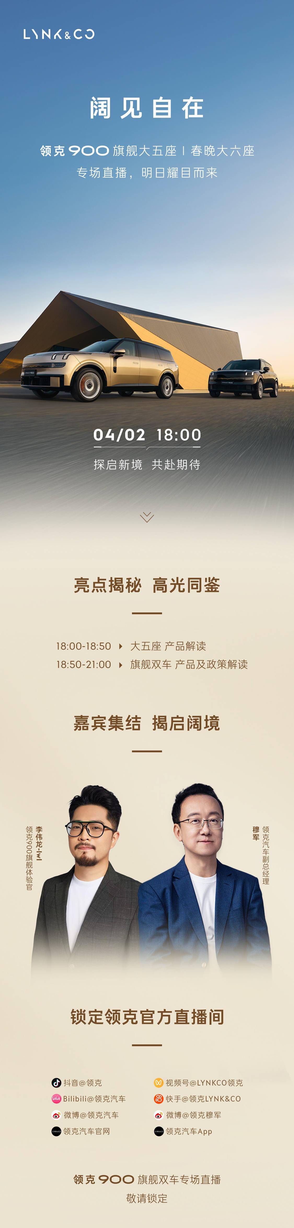 領克汽車官方正式對外宣布,旗下兩款全新車型——領克900旗艦大五座與“春晚大六座”將于4月2日18時迎來首次亮相。此次發布的新車陣容引發市場廣泛關注,尤其是大五座版本憑借多項創新設計成為焦點。