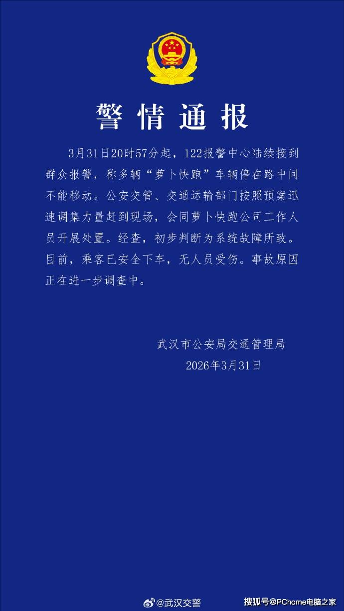 武漢市公安局交通管理局發布通報,確認3月31日晚間多輛“蘿卜快跑”自動駕駛車輛在武漢市區道路出現集體停滯故障。據初步調查,事故由系統異常引發,未造成人員傷亡,具體原因仍在深入核查中。