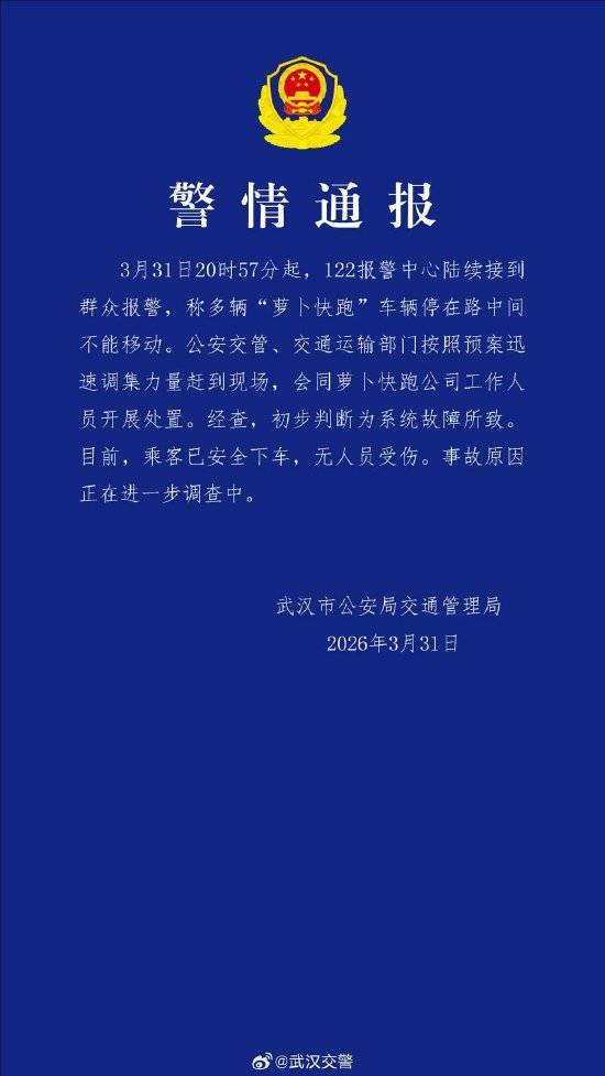 武漢市公安局交通管理局近日發布通報稱,3月31日晚間,武漢多個路段出現多輛“蘿卜快跑”自動駕駛車輛集體停滯現象。涉事車輛均停在道路中央無法繼續行駛,現場未造成人員傷亡,所有乘客已在相關部門協助下安全轉移。交管部門聯合交通運輸局及運營企業第一時間啟動應急預案,目前具體技術故障原因仍在深入排查中。