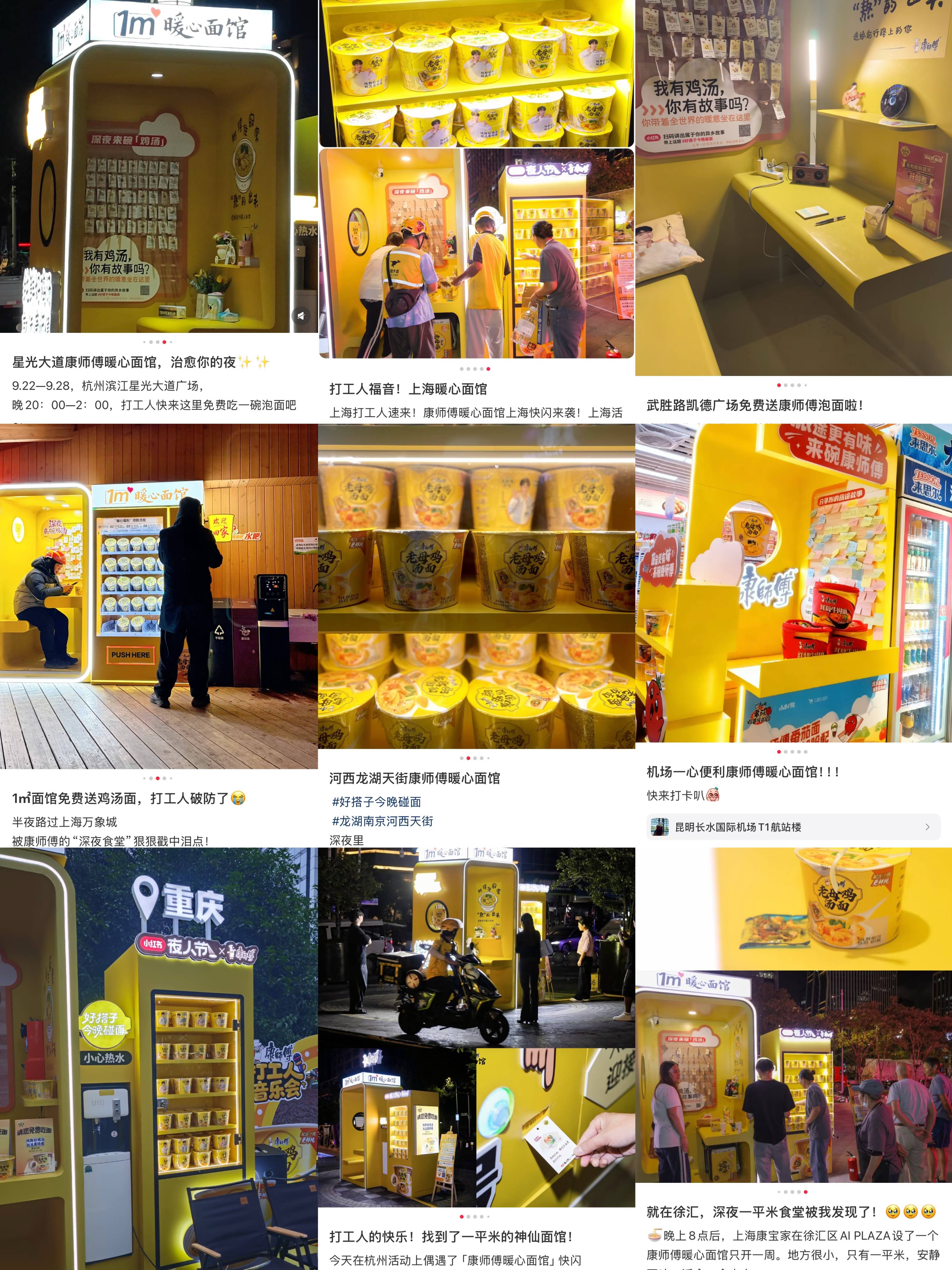快消渠道的本質是連接人與貨的節點,而康師傅的創新在于,將這個節點從冰冷的“交易點”升溫為有情緒的“共鳴點”。“1㎡暖心面館”便是這一理念最生動的注腳。2025年9月起,形似電話亭的快閃面館陸續落地上海、杭州、深圳、安徽、四川、重慶、南京、甘寧、湖北等城市,以“1㎡私密空間+免費暖心泡面”為核心體驗,每晚八點到凌晨兩點,為奔波的騎手、晚歸的白領等城市夜歸人送上熱騰騰的老母雞湯面。這里不僅提供食物,更搭配治愈音樂和心事交換墻,迅速在社交媒體上發酵為一座座“情感地標”,“深夜治愈”與“城市溫暖”成為深入人心的標簽。