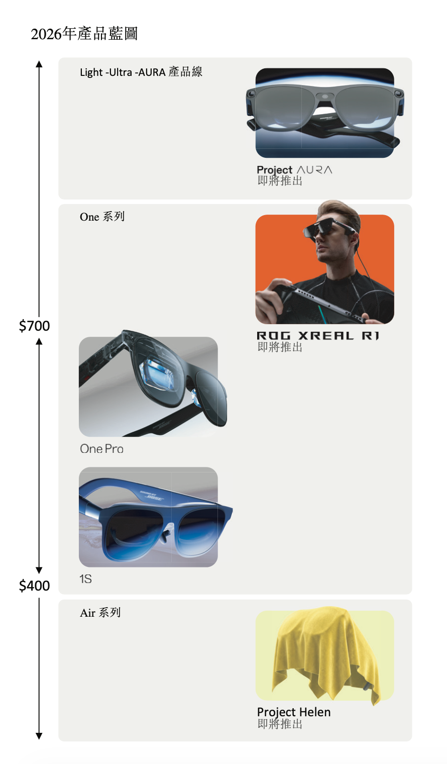 在技術與產品層面,XREAL構建了“自研光機+自研芯片”的核心護城河,旗下Air系列與One系列產品廣受全球消費者認可。面對2026年的市場機遇,XREAL公布了全產品線矩陣藍圖,包括:面向大眾市場的普及型眼鏡“Project Helen”;與頂級電競品牌ROG(玩家國度)合作的專業電競眼鏡“R1”;以及與Google(谷歌)共同開發、深度集成空間計算與多模態AI能力的下一代旗艦XR產品“Project Aura”等。