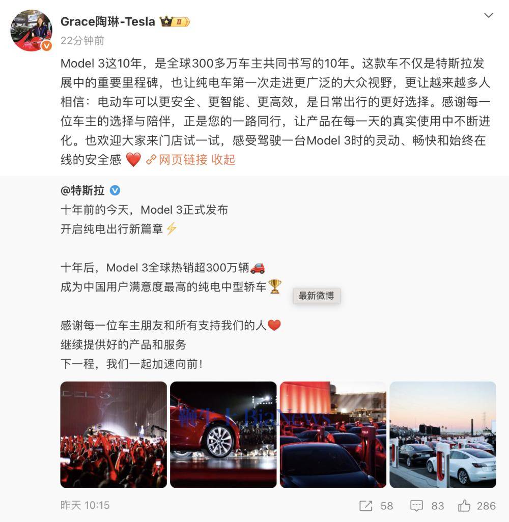 特斯拉副總裁陶琳近日在社交平臺發文,對Model 3發布十周年進行了回顧。她指出,過去十年間,全球超過300萬名車主共同見證了這款車型的成長,他們的選擇與反饋成為產品迭代的重要動力。