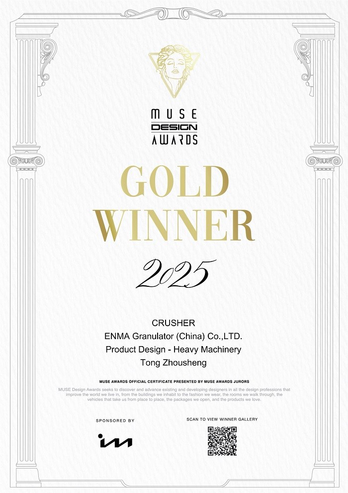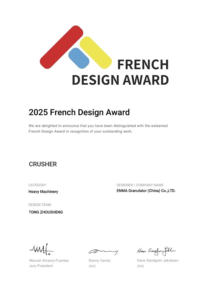 法國(guó)恩瑪 CEO 童周勝先生深耕塑料回收利用設(shè)備制造領(lǐng)域多年,憑借深厚的技術(shù)積淀,于 2025 年攜手恩瑪中國(guó)公司首席設(shè)計(jì)師歐李飛先生,聯(lián)合研發(fā)出全新一代單軸撕碎機(jī)。該創(chuàng)新產(chǎn)品憑借出色設(shè)計(jì)與硬核實(shí)力,一舉斬獲法國(guó)設(shè)計(jì)獎(jiǎng)、德國(guó)紅點(diǎn)設(shè)計(jì)獎(jiǎng)、美國(guó)好設(shè)計(jì)獎(jiǎng)、MUSE 設(shè)計(jì)獎(jiǎng)等多項(xiàng)國(guó)際頂級(jí)設(shè)計(jì)大獎(jiǎng),用權(quán)威榮譽(yù)印證了恩瑪在破碎回收行業(yè)的創(chuàng)新引領(lǐng)地位。