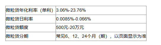 微粒貸借錢按日計息,最新的年化利率(單利)一般在3.06%—23.76%之間(日利率為0.0085%—0.066%)。每個人的微粒貸利率多少是由系統評估的,輸入借款金額、選擇分期期數后,在還款計劃中可以看到自己的利率。