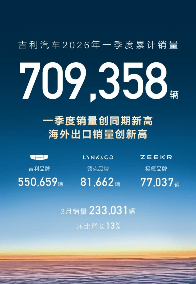 當汽車行業仍在價格戰的漩渦中掙扎,市場在傳統燃油與新能源之間搖擺不定時,吉利汽車以一組亮眼的數據,向外界宣告了中國品牌的新高度。2026年第一季度,吉利累計銷量突破70萬輛,以709,358輛的成績登頂中國汽車自主品牌銷量榜首。其中,3月單月銷量達233,031輛,環比增長13%。更值得關注的是,集團新能源車型銷量占比首次超過52%,達到369,059輛,標志著吉利正式邁入“新能源為主、燃油協同”的高質量發展階段。