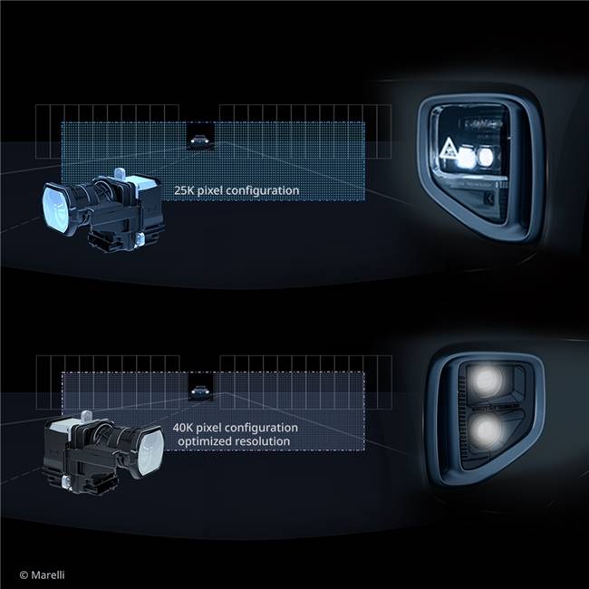 作為智能照明核心組件,馬瑞利此次展出的h-Digi? MicroLED系列引發行業關注。該模組提供25K與40K兩種像素密度選擇,其中40K版本達到每平方英寸12000個獨立可控光點,可實現像素級光型控制。在自適應遠光(ADB)測試中,該技術能精準遮蔽對向車輛區域,照射距離較傳統LED提升40%。更值得關注的是,其投影功能支持在地面投射導航箭頭、警示標識等信息,為L3級自動駕駛提供輔助視覺提示。