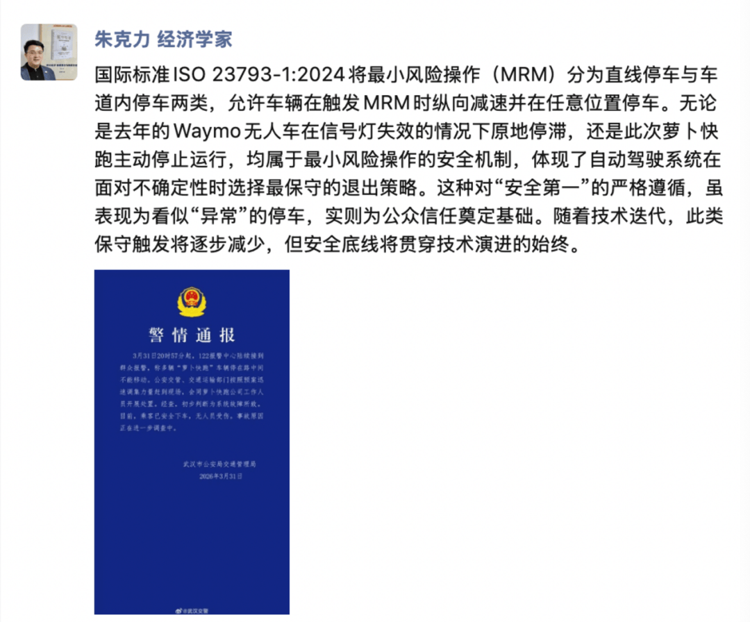 3月31日晚,武漢街頭一輛“蘿卜快跑”無人駕駛汽車突然平穩停下,雙閃燈規律閃爍。這一場景被路人拍下后迅速在社交平臺引發熱議,有人戲稱“科幻片成真了”,也有人質疑技術可靠性。無獨有偶,數月前美國舊金山街頭也出現過類似場景——Waymo無人車在無事故情況下主動駐停。兩次事件背后,折射出公眾對自動駕駛技術安全性的復雜認知。