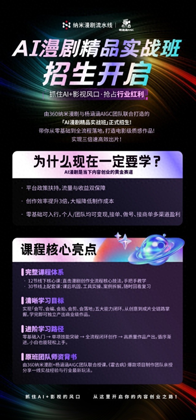 在培養方式上,本次課程采用小班制項目實訓模式,由360官方技術專家駐場解決工具與流程問題,楊涵涵導演團隊提供創作方法論指導與行業經驗支持。學員結業后將完成完整項目級作品集,可直接用于求職或承接商業項目,實現從學習到進入制作一線的能力轉化,打通AI漫劇人才培養與產業需求之間的連接通道。
